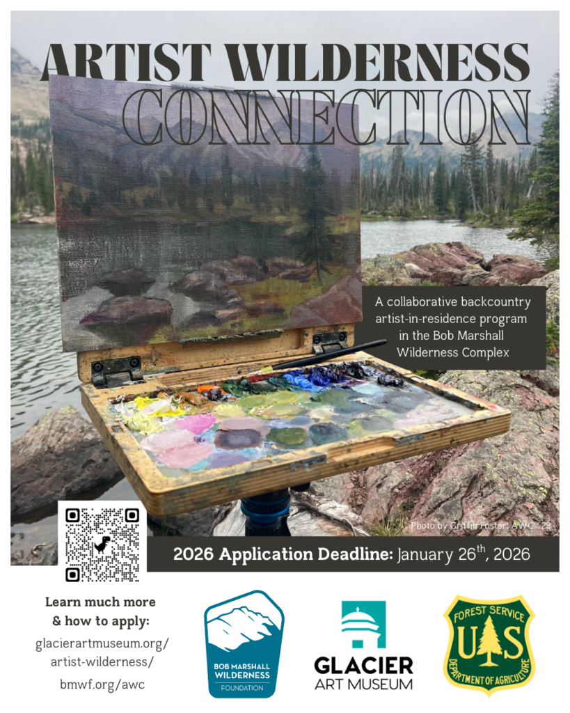 Apply for the 2026 Artist Wilderness Connection Residency here —-> using our google form. No cost to apply! For any questions regarding your application, please email info@glacierartmuseum.org or call (406)-755-5268. Deadline to submit an application is January 26, 2026. Thank you!