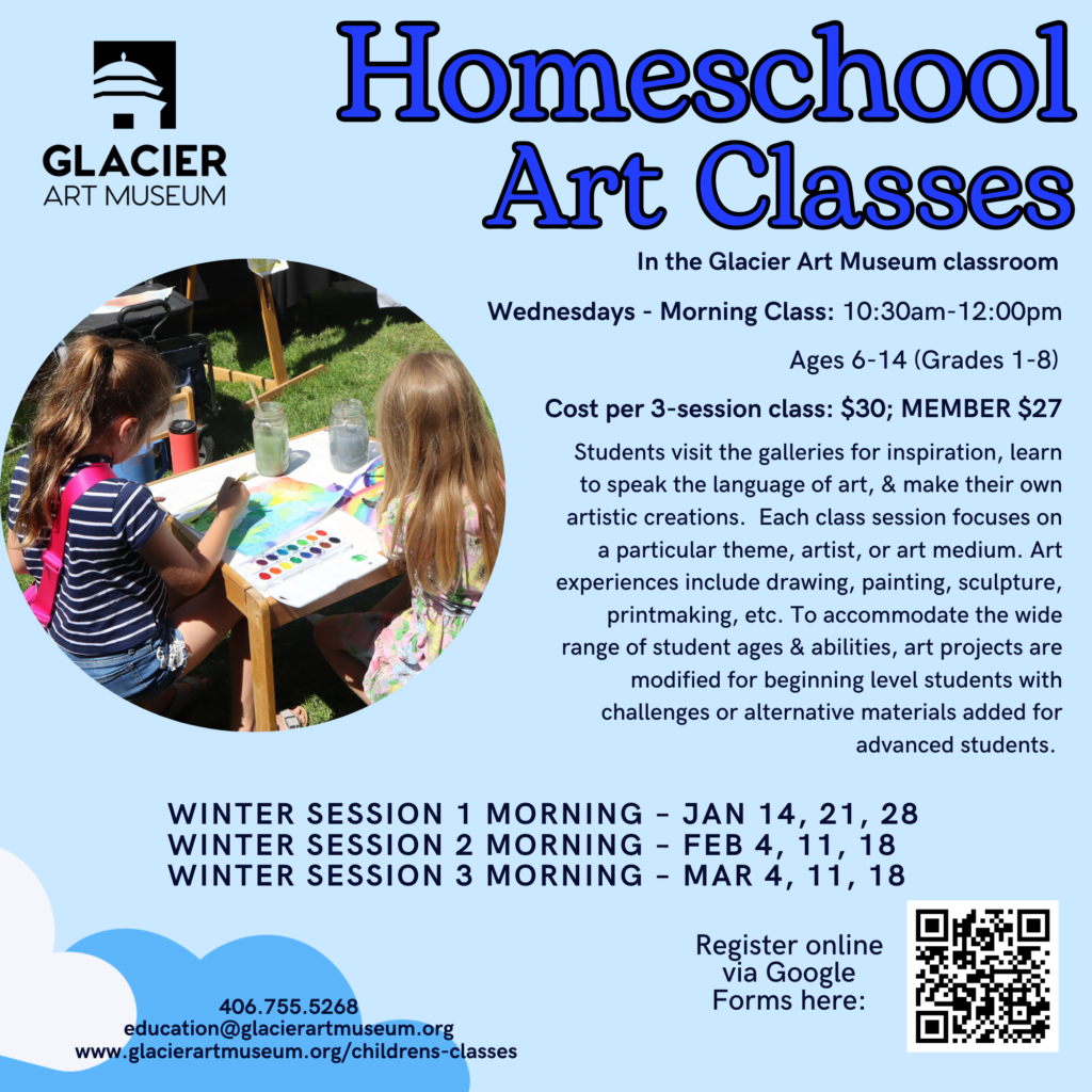 Full or partial scholarships for children’s classes for those with financial need are available through the Glacier Art Museum Ed Bailey Scholarship fund. Please direct Scholarship requests to Kathy Martin, Director of Education (education@glacierartmuseum.org), before signing up for class.