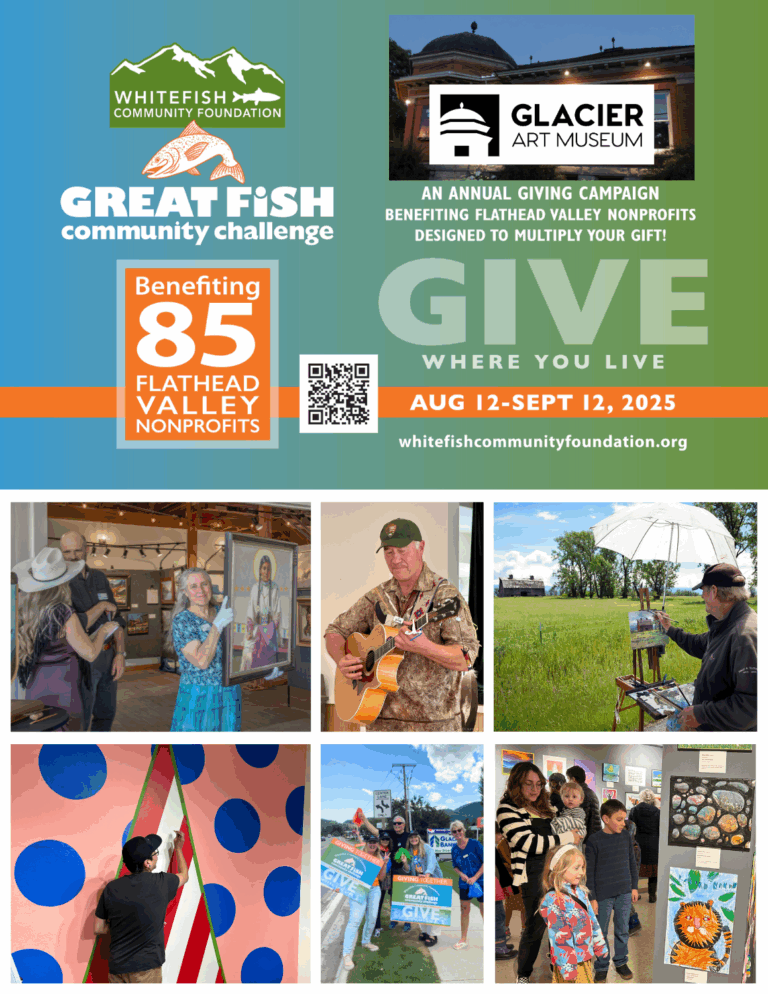 The Glacier Art Museum is extremely grateful and excited to be selected for the 11th annual Whitefish Community Foundation’s Great Fish Community Challenge fundraising campaign, running August 12 to September 12 and benefitting 85 Flathead Valley nonprofits! Please give a donation of any amount for the Glacier Art Museum/Hockaday to help support our educational programs in the coming year, and reach our $50,000 goal to be eligible for the the percentage match grant!